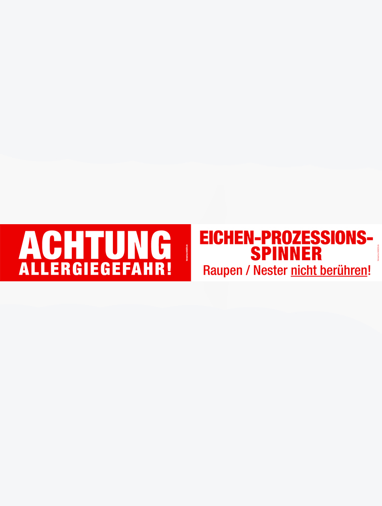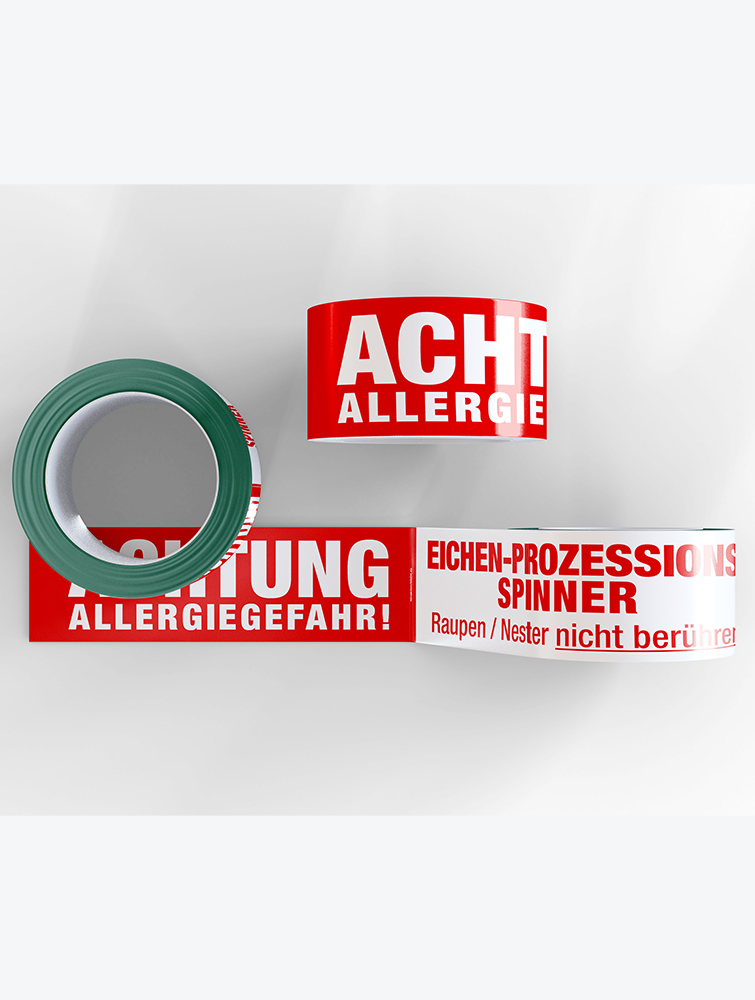 Absperrband/Flatterband zur Warnung vor dem Eichenprozessionsspinner. Die reißfesten und lichtechten Flatterbänder eignen sich zu deutlich sichtbaren Absperrungen von Gefahrenbereichen (weißes PVC-Band, mit rotem Aufdruck).