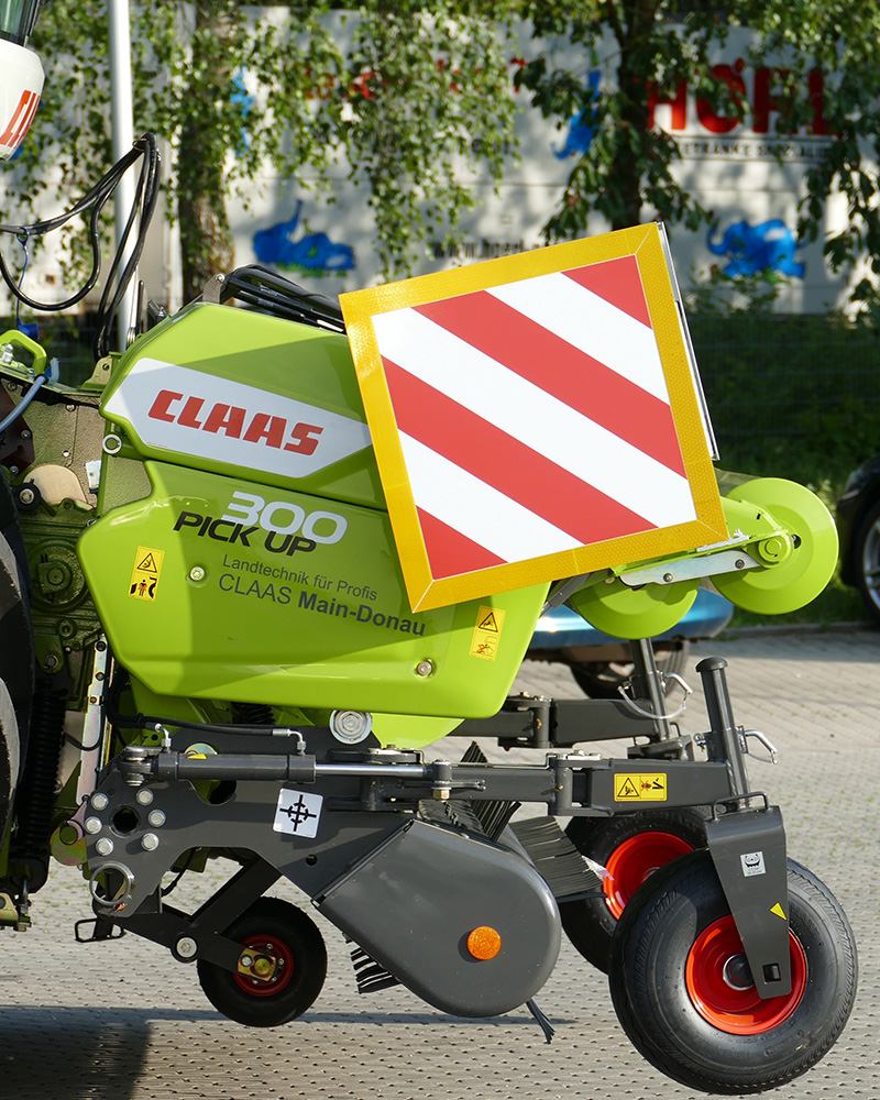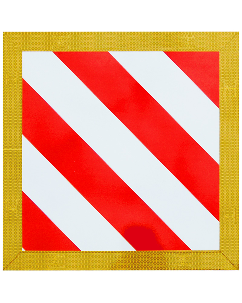 Rundum laufendes, 1-teiliges, gelbes Reflektorband 50 mm (DIN 30710) für mehr Sicherheit und Sichtbarkeit im Straßenverkehr. Rot-weiß bedruckt mit UV-Schutzlaminat in zwei Varianten: